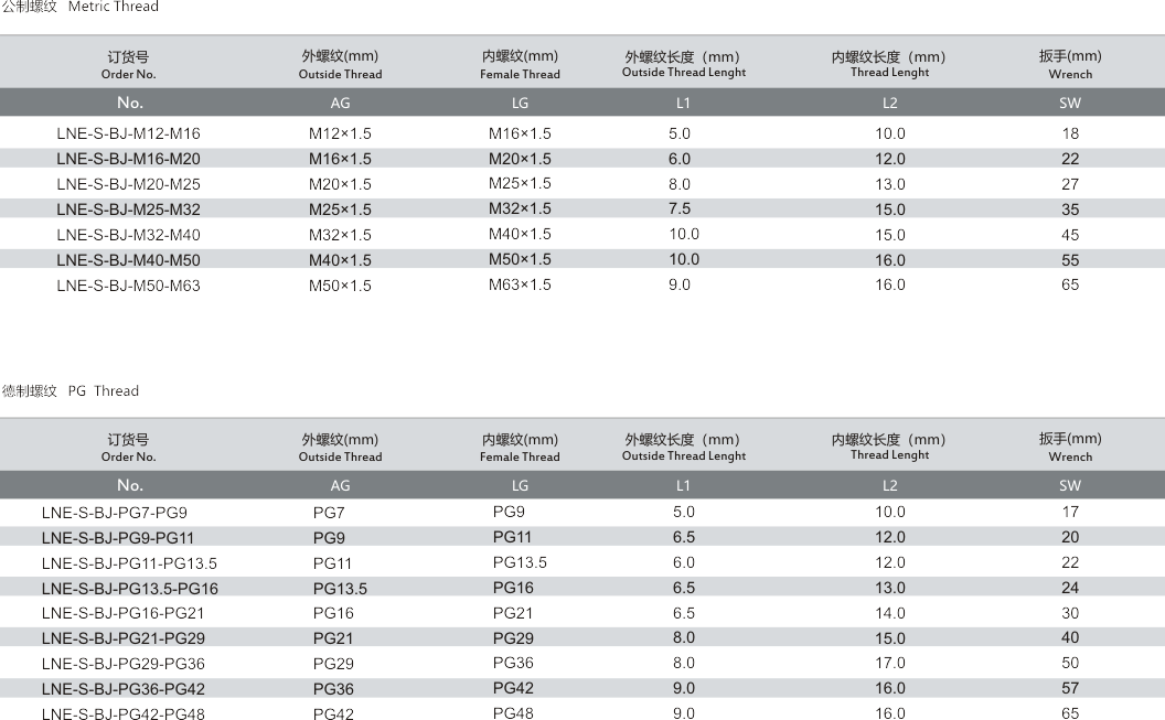 產(chǎn)品規(guī)格:公制(M)、德制(PG)