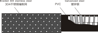 產(chǎn)品材質(zhì):(外層)采用不銹鋼編織網(wǎng),(中間層)采用PVC,(內(nèi)層)采用鍍鋅鋼。