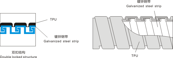 2、表面采用TPU材料低煙無(wú)鹵、環(huán)保安全。內(nèi)部采用熱鍍鋅鋼帶。
