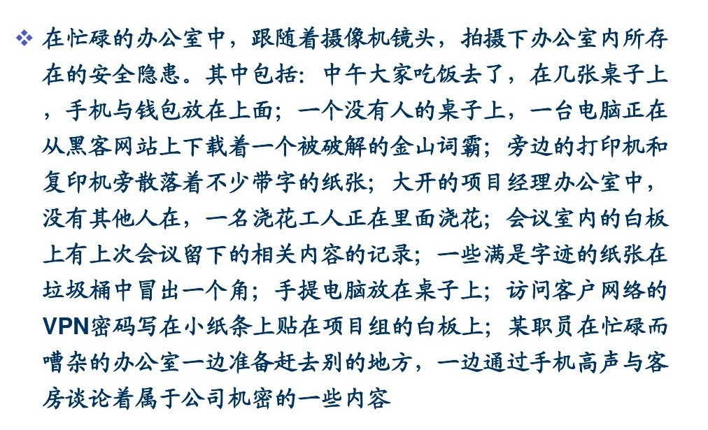 請(qǐng)大家跟隨某企業(yè)公司的“調(diào)查攝像機(jī)鏡頭”一同來看一個(gè)關(guān)于辦公室中信息安全泄露隱患的列舉實(shí)例: